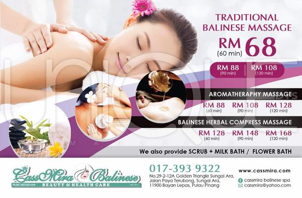 Cassmira Balinese Spa menawarkan perkhidmatan spa tradisional Bali dengan suasana tenang, terapi aromaterapi dan perawatan kulit premium di lokasi strategik Jln Paya Terubung, Sungai Ara, 11900 Bayan Lepas, Pulau Pinang, Malaysia. Staf berkelayakan tinggi memastikan kepuasan pelanggan, sementara kemudahan tempahan melalui +60 17-393 9322 memudahkan akses kepada layanan eksklusif ini.